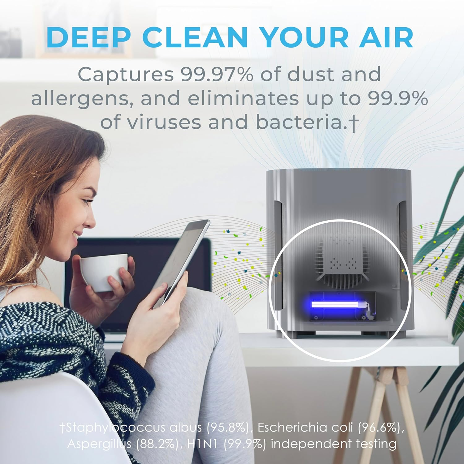 - Deep Clean Your Air: The powerful, True HEPA filter with the built-in UV-C light adds a deeper level of cleanliness. Captures 99.97% of dust and allergens, and eliminates up to 99.9% of viruses and bacteria. (Staphylococcus albus (95.8%), Escherichia coli (96.6%), Aspergillus niger (88.2%), H1N1 (99.9%) independent testing)